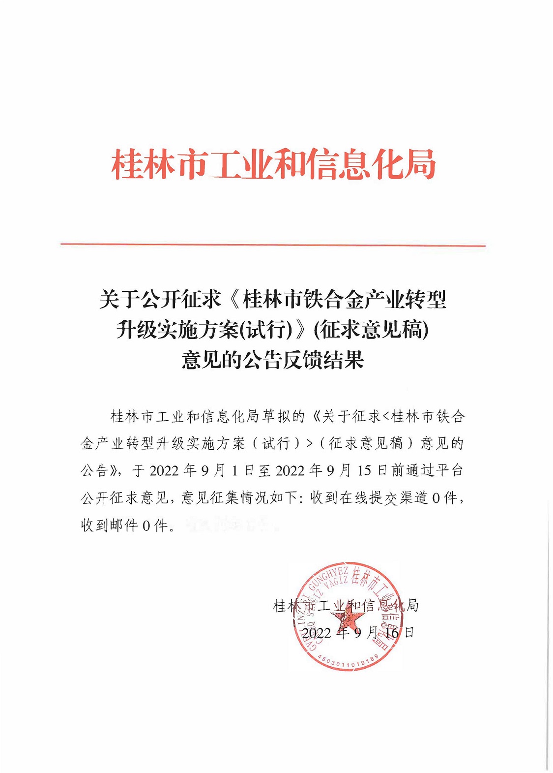 桂林市工业和信息化局关于公开征求《桂林市铁合金产业转型升级实施方案(试行)》(征求意见稿)意见的公告反馈结果